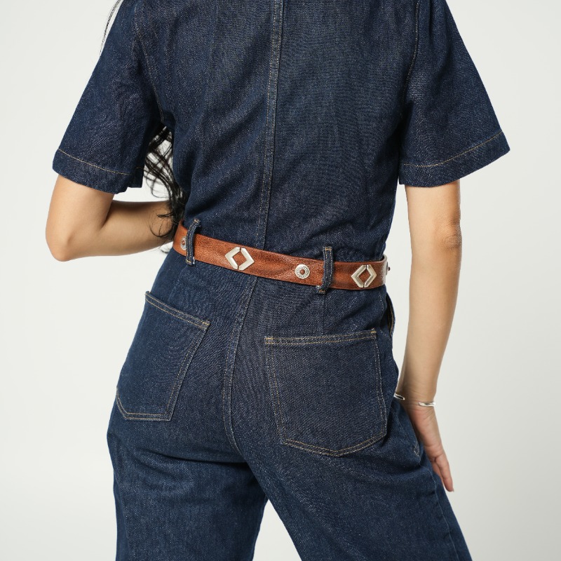 Γυναικεία ζώνη μόδας σε καφέ δέρμα με ασημί αγκράφα και διακοσμητικά στοιχεία. Συνδυασμένη με denim jumpsuit και fashion αξεσουάρ, προσθέτει δυναμισμό και κομψότητα στο outfit.