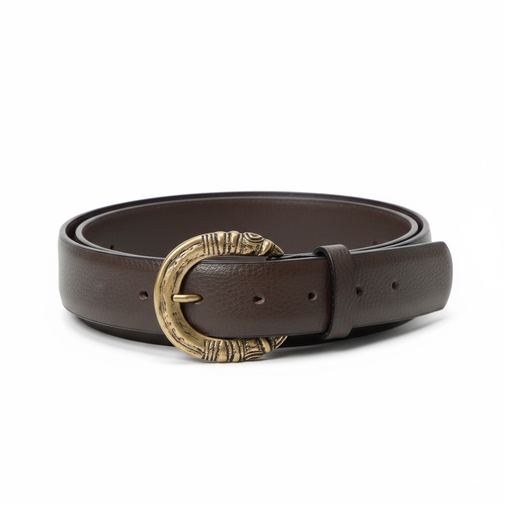 H καφέ δερμάτινη ζώνη αποπνέει ζεστασιά και αυθεντικότητα, ενώ η χρυσή παλαιωμένη σκαλιστή αγκράφα προσθέτει μια αίσθηση διαχρονικής πολυτέλειας. Ένα αξεσουάρ που συνδυάζει το κλασικό με το ιδιαίτερο, ιδανικό για εμφανίσεις που ξεχωρίζουν με λεπτομέρειες.