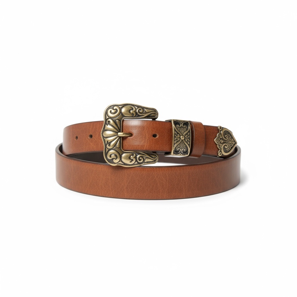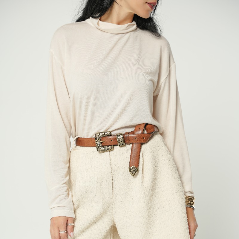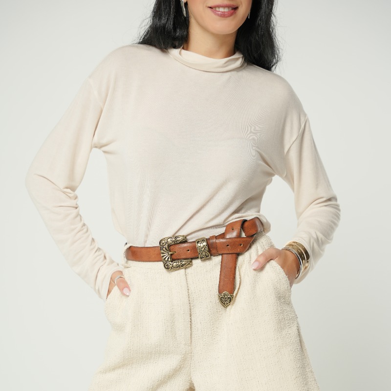 Μια ταμπά δερμάτινη ζώνη με χρυσή αγκράφα που συνδυάζει κομψότητα και διαχρονικότητα. Το ζεστό ταμπά χρώμα της αναδεικνύει την φυσική υφή του δέρματος, ενώ η λαμπερή αγκράφα προσθέτει μια εκλεπτυσμένη πινελιά. Ιδανική για καθημερινά ή πιο formal looks, δίνει έμφαση στη μέση και ολοκληρώνει κάθε outfit με υπόσχεση κλασικής πολυτέλειας.