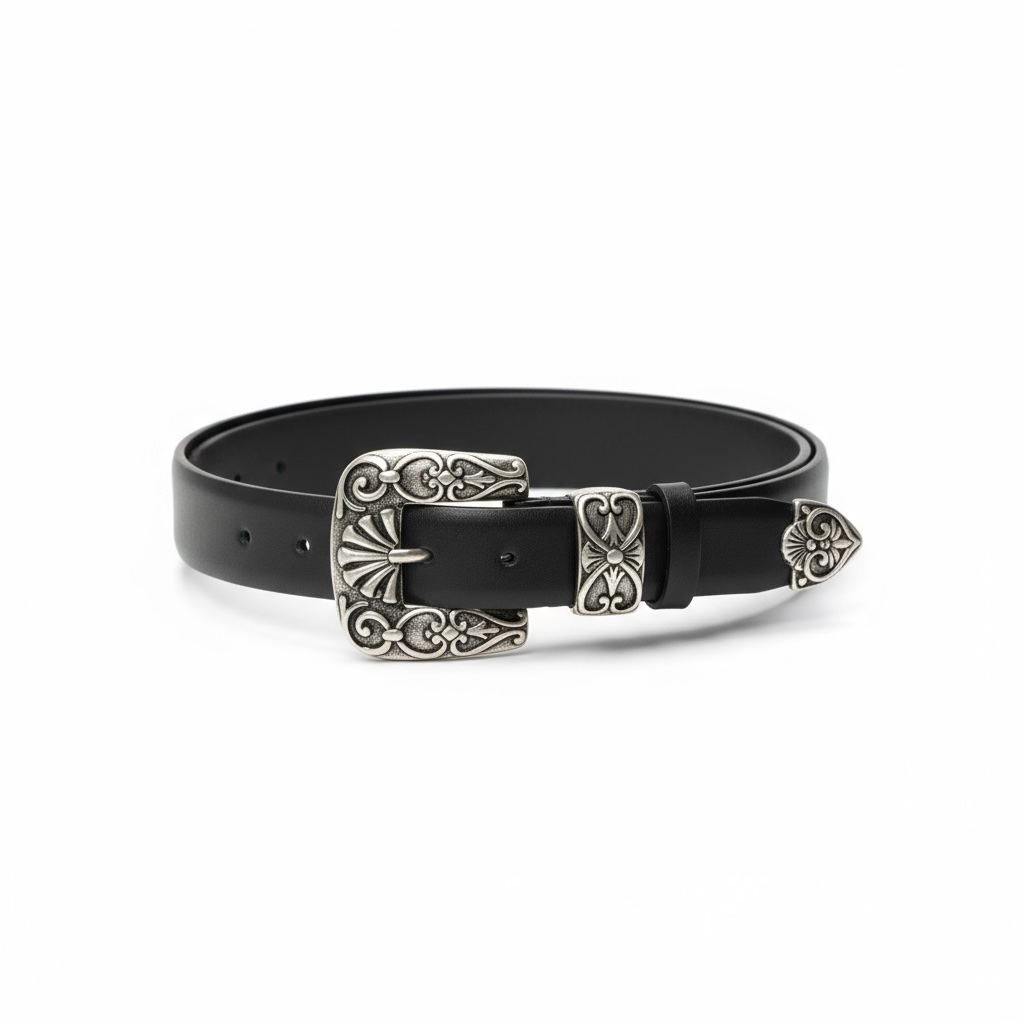 Μια μαύρη δερμάτινη ζώνη με ασημί αγκράφα που συνδυάζει κομψότητα και διαχρονικότητα. Το μαύρο χρώμα της αναδεικνύει την φυσική υφή του δέρματος, ενώ η λαμπερή αγκράφα προσθέτει μια εκλεπτυσμένη πινελιά. Ιδανική για καθημερινά ή πιο formal looks, δίνει έμφαση στη μέση και ολοκληρώνει κάθε outfit με υπόσχεση κλασικής πολυτέλειας.